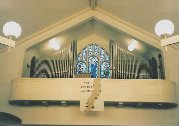 The organ is an original installation. It is installed in the rear gallery of the church in divided cases. The Great is on the left with the Pedal behind, and the Swell is on the right. Both divisions are surrounded by a two-sided facade. Each contains 28 pipes along the front, 7 pipes at the corner tower, and 11 pipes along the side to the back wall. The Great 8' Open Diapason is the only unenclosed manual rank, with pipes 2, 4, 6, 8, and 10-thru-34 of the facade speaking as notes 1-29 of that rank.